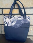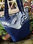 - Medium-sized dark blue handmade bag with a blue and white print. Can be used for travel, work, school, and casual purposes.