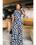 Cotton Ankara High waist flared pants matched with a fitted top with feather detailing on the sleeves.