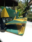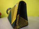 A cotton fabric folding clutch made with African print Ankara fabric and Ankara print lining. The item has a snap clasp to fold it shut, and features an interior pocket with a zipper.