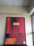 The paintings are 39 by 25 inches in size. The colors are red, orange, gold, and dark blue. A painting finished off with a well done wooden frame in a dark brown color.