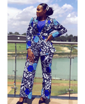 Cotton Ankara Two piece set suit with wide legged pants and a buckle fitted blazer.