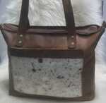 A hand bag made from cowhide leather with hair on the outer pocket. Its an all-round use accessory.