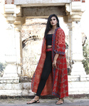 his hand woven free size kimono dress is made in organic cotton with all natural ingredients. It is perfect and versatile enough to take you from a meeting to casual lunches and to beaches too. Style it as a kimono dress or a shrug according to your mood of the day. This has a stand collar and comes with a fabric belt.